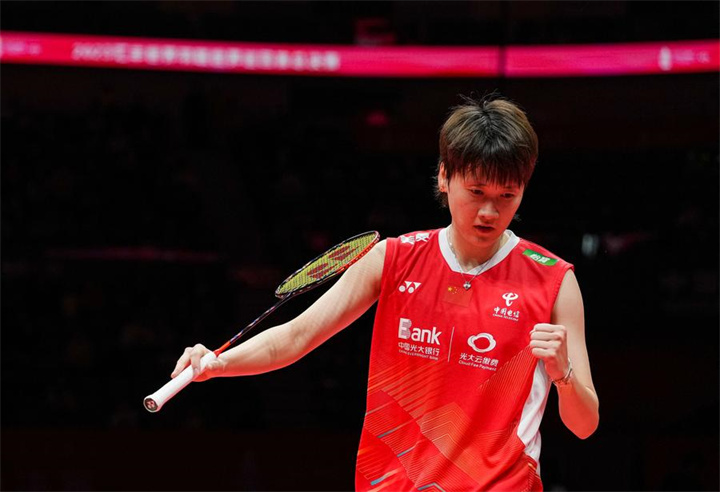 Chen Yufei celebrates during her women's singles group B match against Zhang Beiwen of the United States at BWF World Tour Finals 2023 in Hangzhou, China, Dec. 14, 2023. (Xinhua/Sun Fei)