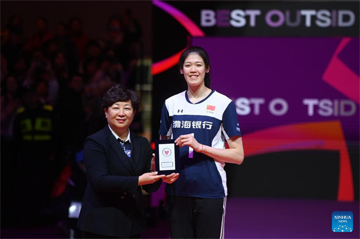 Li Yingying (R) of Tianjin Bohai bank is presented with the Best Outside Hitter award for the 3-4 final match between Tianjin Bohai Bank of China and Dentil Praia Clube of Brazil at FIVB Volleyball Women's Club World Championship 2023 in Hangzhou, east China's Zhejiang Province, Dec. 17, 2023. (Xinhua/Huang Zongzhi)