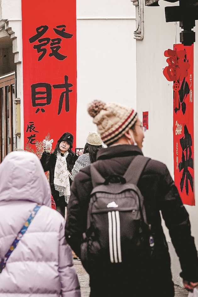 Merchants decorates stores with the Spring Festival couplets having the blessings of the Year of the Dragon, attracting tourists to take photos at the Southern Song Imperial Street, February 7.