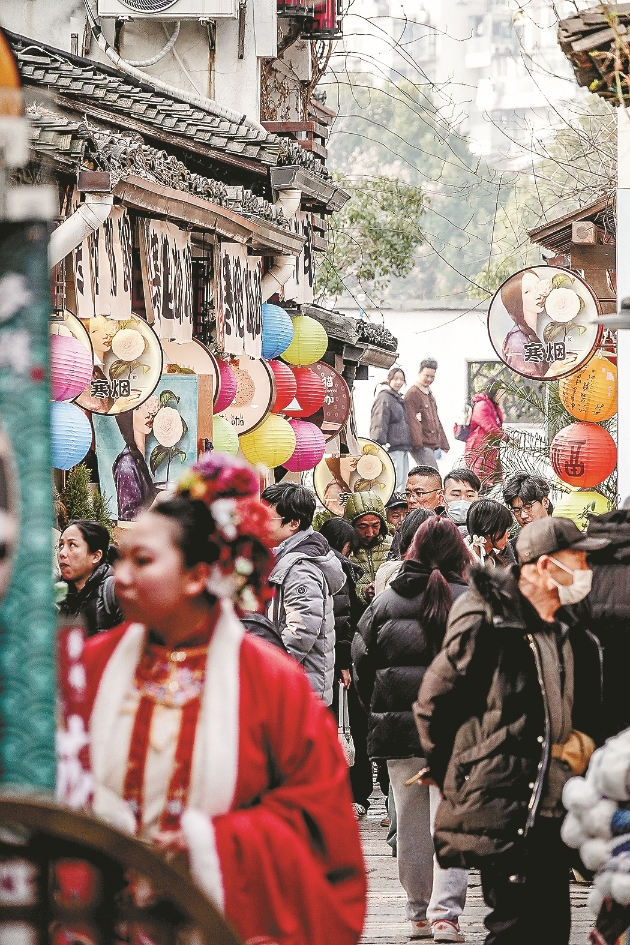 Tourists stroll around the Spring Festival fair at Xiaohe Historical Street, February 8.