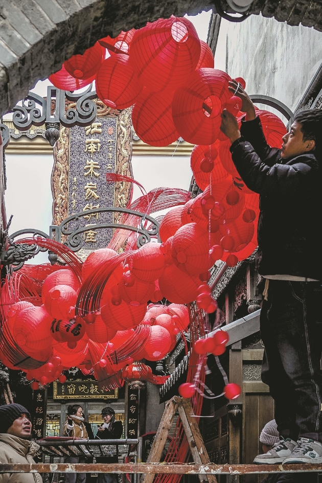 People adorn courtyards with bright red lanterns at Qinghefang Historical Street, February 7.