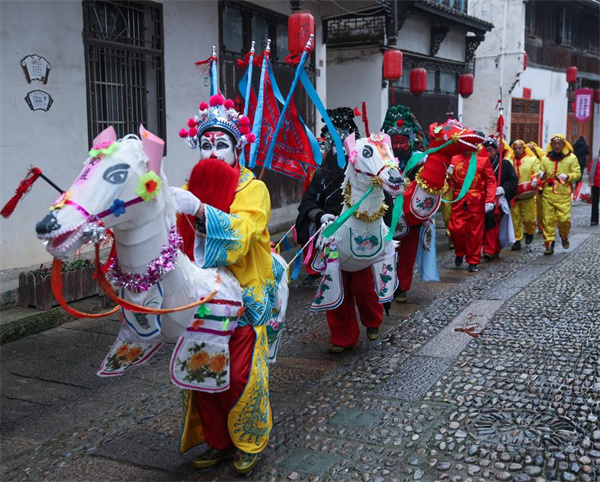 Folk artists take part in performances in celebration of the upcoming Lantern Festival in Heqiao Town, Lin'an District of Hangzhou, east China's Zhejiang Province, Feb. 23, 2024. (Xinhua/Xu Yu)
