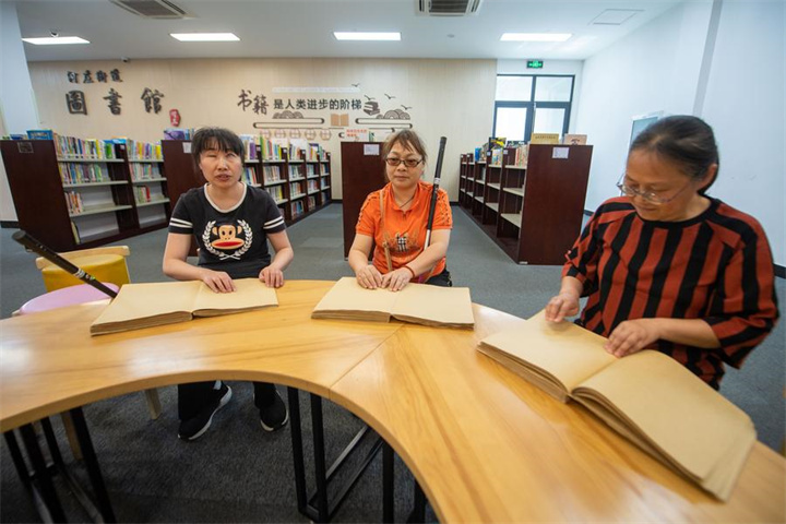 Visually impaired people read Braille books at the library of Hezhuang cultural and sports center in Qiantang District of Hangzhou, east China's Zhejiang Province, May 16, 2024. (Xinhua/Jiang Han)