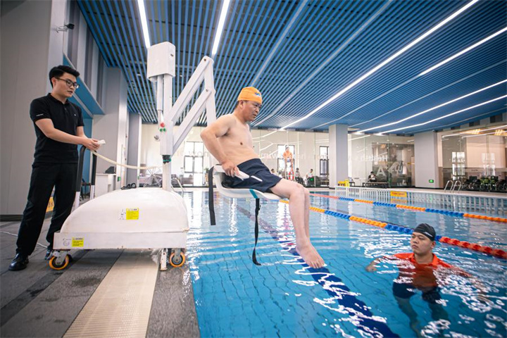 A staff member (L) uses a lift to help a disabled man enter the barrier-free swimming pool at Hezhuang cultural and sports center in Qiantang District of Hangzhou, east China's Zhejiang Province, May 16, 2024. (Xinhua/Jiang Han)
