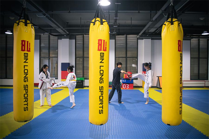 Disabled people practice Taekwondo under the guidance of the coach (2nd R) at the Taekwondo training base for people with disabilities at Hezhuang cultural and sports center in Qiantang District of Hangzhou, east China's Zhejiang Province, May 16, 2024. (Xinhua/Jiang Han)