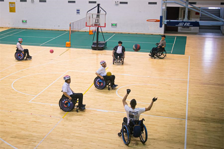 Disabled people play basketball at the gymnasium of Hezhuang cultural and sports center in Qiantang District of Hangzhou, east China's Zhejiang Province, May 16, 2024. (Xinhua/Jiang Han)