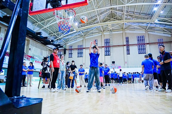 Special Olympics athletes, accompanied by their parents and volunteers from Zhejiang Gongshang University, participated in 10 engaging yet safe activities, including softball, fast foot races, rope jumping, timed basketball shooting, AI dancing, dry land curling, and floor bowling.