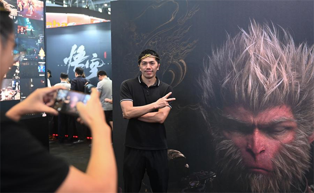 A visitor poses for photos at the booth of "Black Myth: Wukong" during the third Global Digital Trade Expo in Hangzhou, east China's Zhejiang Province, Sept. 25, 2024. (Xinhua/Huang Zongzhi)