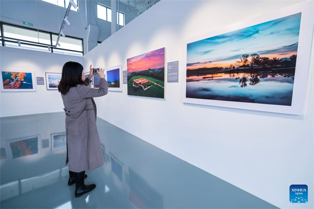 A visitor takes photos at a photography exhibition themed on China's world heritage in Hangzhou, east China's Zhejiang Province, Nov. 25, 2024. The exhibition held here on Monday presents China's 59 sites that have been inscribed on the UNESCO World Heritage List. (Xinhua/Xu Yu)