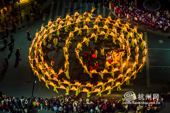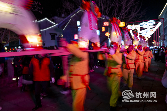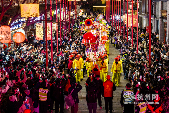 The intangible cultural heritage show was staged in Pingyao Old Street of Hangzhou on February 9. With a length of more than 150 m, the bench dragon meanders under the light, creating the lively atmosphere of the Lantern Festival.