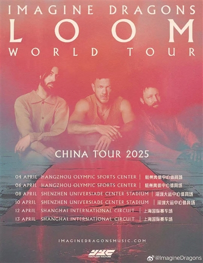 The American rock band has announced that their “LOOM” World Tour will kick off in Hangzhou. Since their debut in 2012, the band has gained immense popularity for its unique pop-rock style and genre-blending music, with over 62 billion streams. This tour will feature their new album LOOM alongside classic hits like Radioactive, Believer, and Thunder.