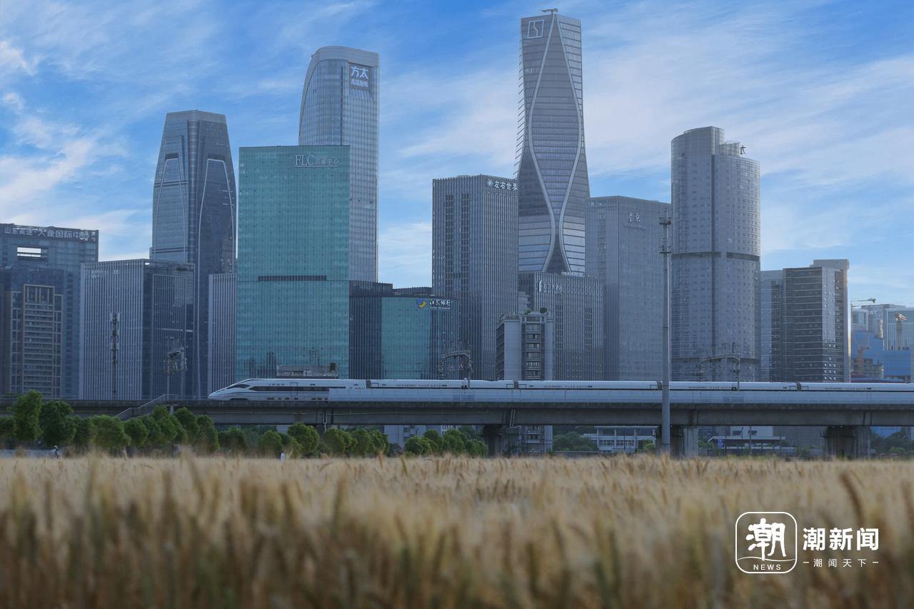 The field transforms into a breathtaking canvas against the backdrop of passing trains and the skyline.