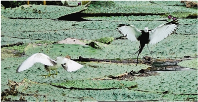 On July 22, at Lotus Beach Waters of Xixi National Wetland Park in Hangzhou,Hydrophasianus chirurguswith black, brown and white plumage played in the water, foraged for food, and incubated the eggs.
