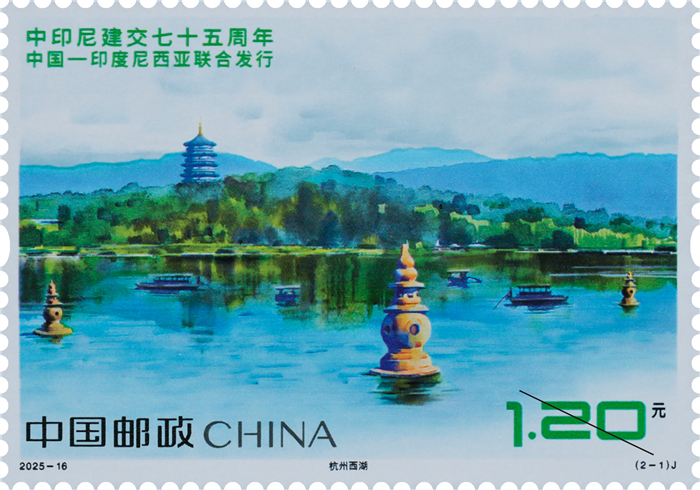 A total of 4.5 million stamp sets will be issued, with each set containing 2 stamps. This set of commemorative stamps features photographs of the West Lake in Hangzhou and Bratan Lake in Indonesia.