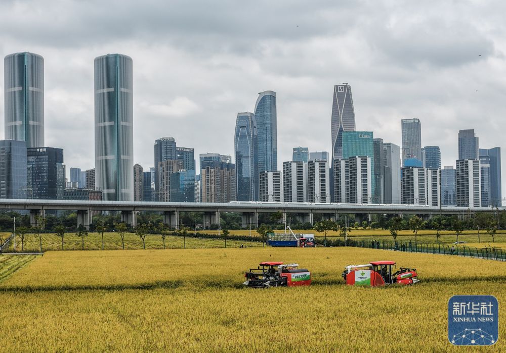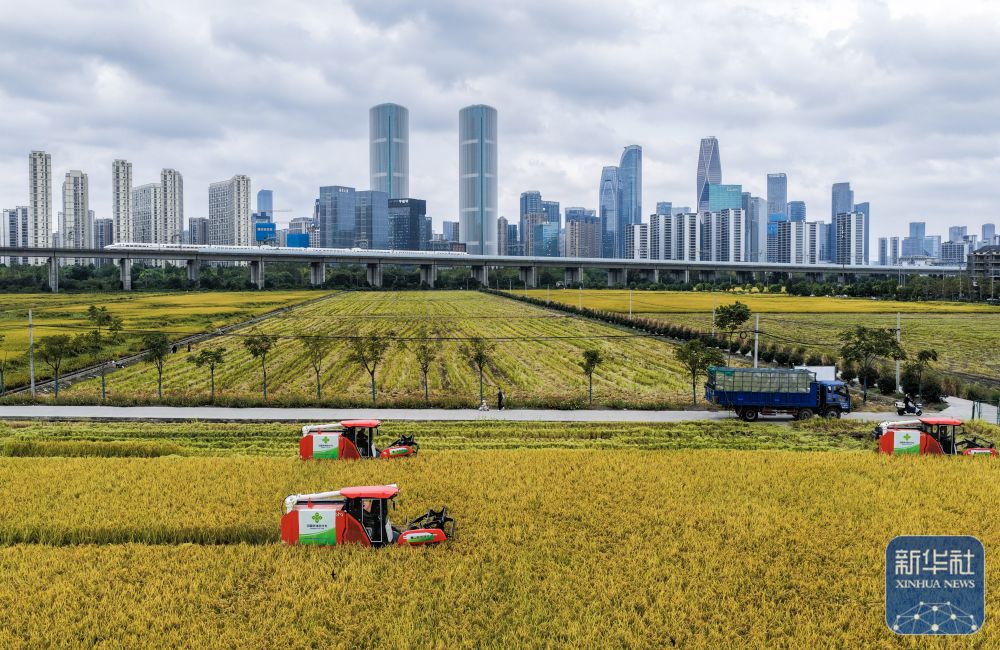Located in the Century Countryside Grain Area, Xiaoshan District, Hangzhou, the paddy field covering an area of more than 3,000 mu achieves a bumper harvest. The golden paddy field, high-speed trains, and urban sky constitute a uniquepicture.