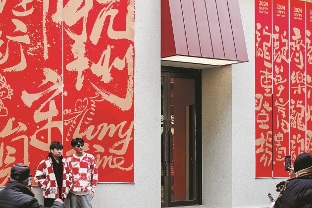 Merchants decorates stores with the Spring Festival couplets having the blessings of the Year of the Dragon, attracting tourists to take photos at the Southern Song Imperial Street, February 7.