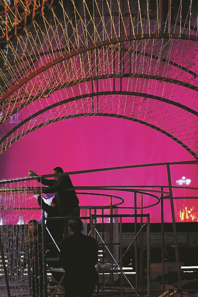 Staff install colorful lamps on buildings at Wulin Square, February 11.