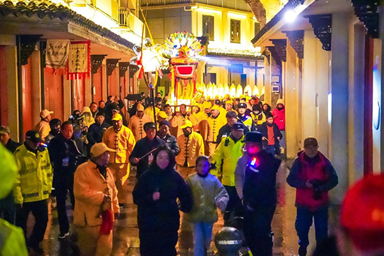 In the evening, the 140m-long bench dragon dance team composed of more than 200 villagers started to perform. Dragon lanterns wandered in the streets, with a cheerful sound of gongs, drums, and firecrackers, sending blessings to the families along the way.