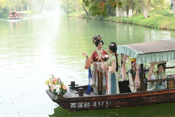 Performers in traditional costumes take a boat parade during the Huazhao Festival celebrations in Xixi Wetland in Hangzhou, east China's Zhejiang Province, March 24, 2024. (Xinhua/Weng Xinyang)