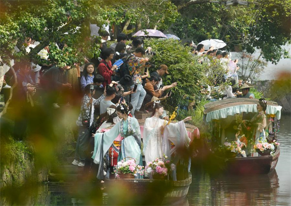 Tourists watch a performance during the Huazhao Festival celebrations in Xixi Wetland in Hangzhou, east China's Zhejiang Province, March 24, 2024. (Xinhua/Weng Xinyang)