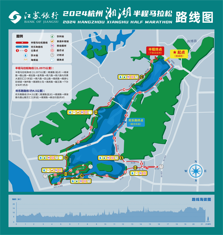 The race will start from Xiangpu Road and end at the Xiasun Cultural Village for the half marathon, while the fun run will conclude at the Senbo Resort. Runners will run along Xianghu Lake, passing landmarks such as the Kuahuqiao Ruins Museum, World Tourism Expo Center, and China Academy of Art Xianghu Campus, allowing them to enjoy the pleasant spring scenery along the way.