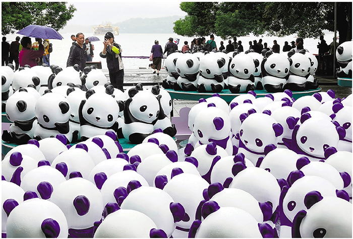 Hangzhou's Hubin Pedestrian Street celebrated International Panda Day on Oct 27 with a stunning display of nearly 300 blue-and-white and black-and-white panda sculptures.
