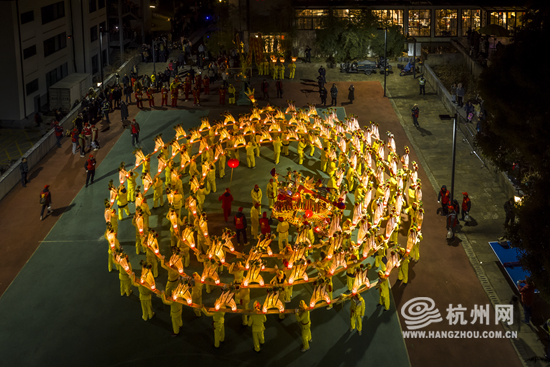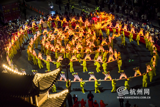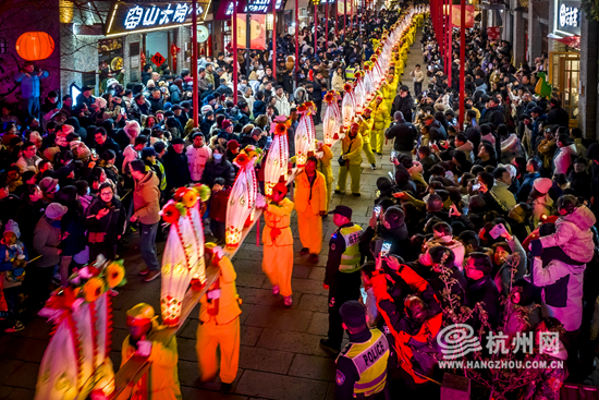 The intangible cultural heritage show was staged in Pingyao Old Street of Hangzhou on February 9. With a length of more than 150 m, the bench dragon meanders under the light, creating the lively atmosphere of the Lantern Festival.
