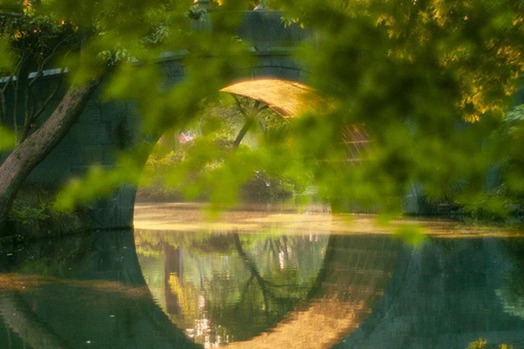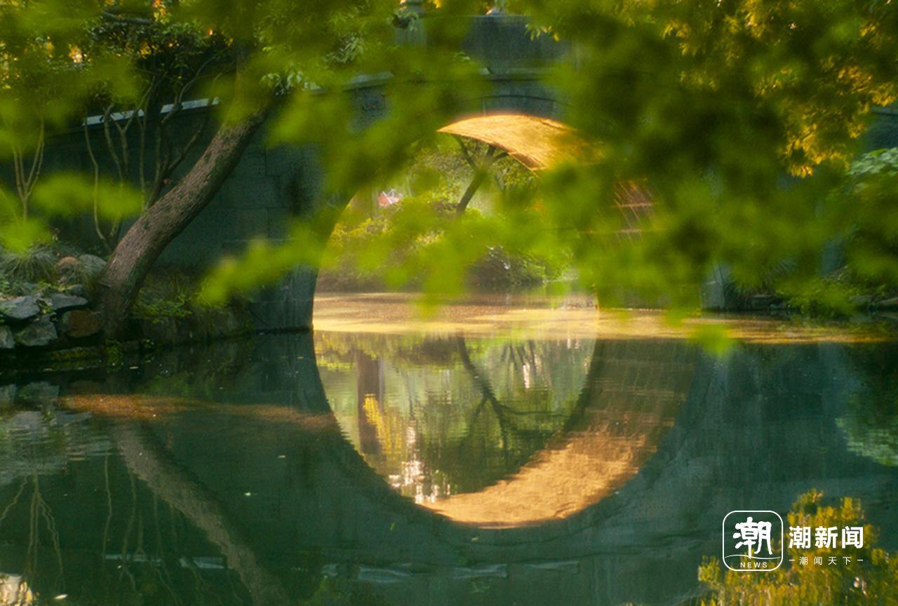 The sunlight sprinkles on the surface of the lake in the early morning. The golden light pierces through the stone arch bridge hole. The whole scene seems to be a fairyland.