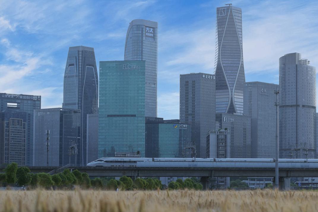 The field transforms into a breathtaking canvas against the backdrop of passing trains and the skyline.