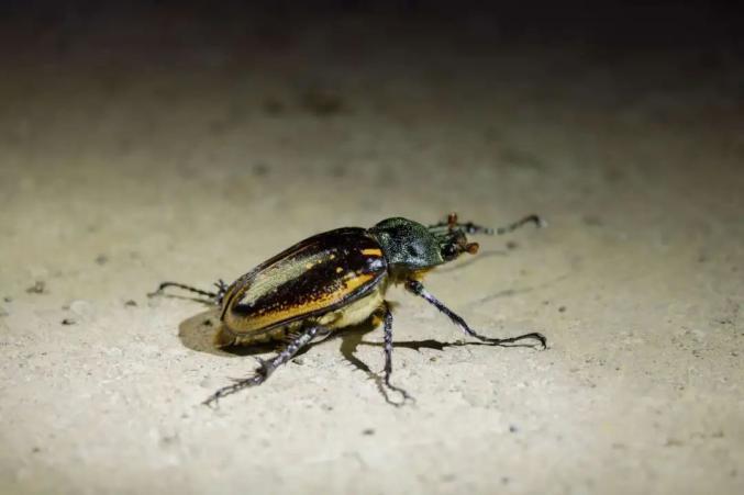 This rare beetle unique to China is a national second-class protected animal, reputed as thepanda of insect kingdom. The male beetle's forelimb is 8.8 cm long, far exceeding the body length. The male and female beetles present bronze green, withgolden patches.