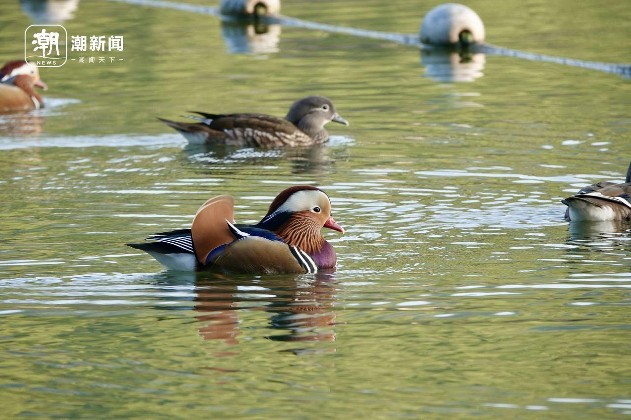 In the water area of Hangzhou Isolated Hill Park, many male mandarin ducks with new bright feathers play on the lake together with female mandarin ducks, to prepare for reproduction in winter and present a beautiful ecological picture to tourists.